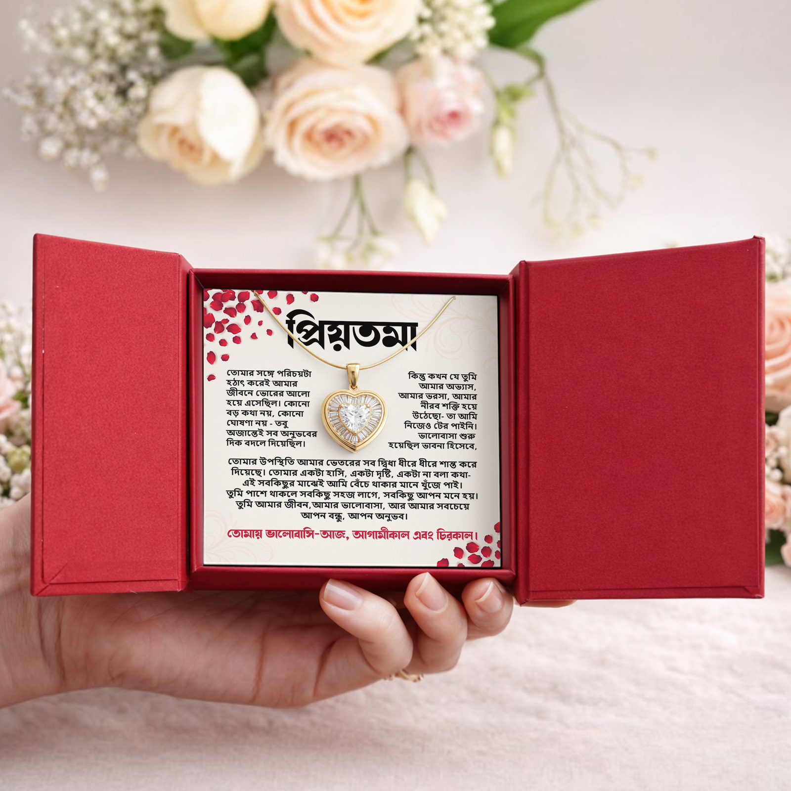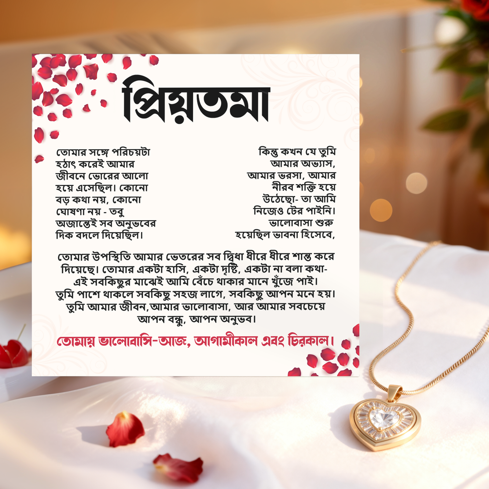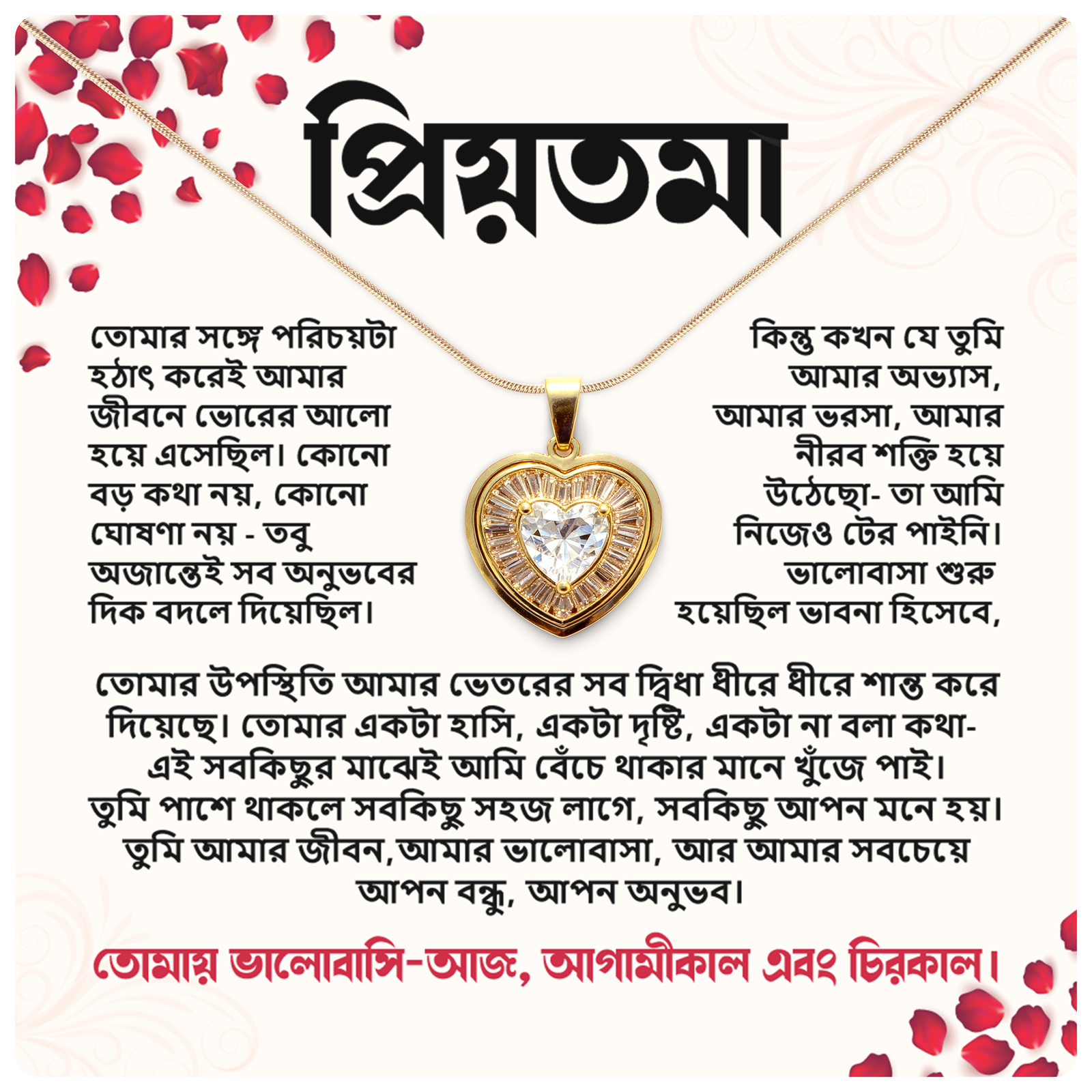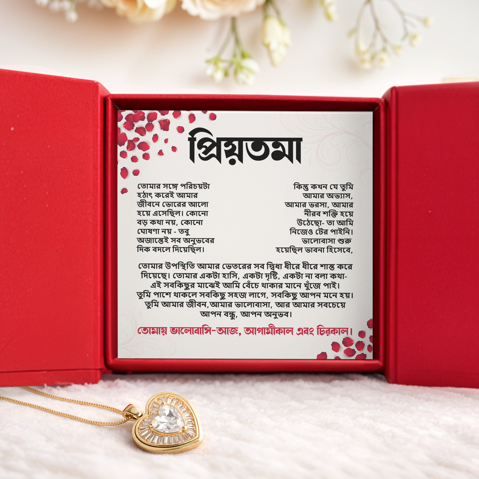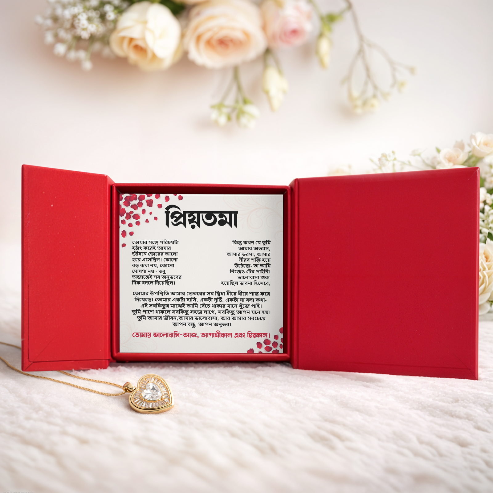 হৃদয়ের ঠিকানা হলো Onuvobe-এর একটি সিগনেচার রোমান্টিক গিফট প্যাকেজ—যেখানে রয়েছে ক্লাসি হার্ট শেপ গোল্ড-লুক নেকলেস এবং হৃদয়ছোঁয়া রেডি মেসেজ কার্ড।