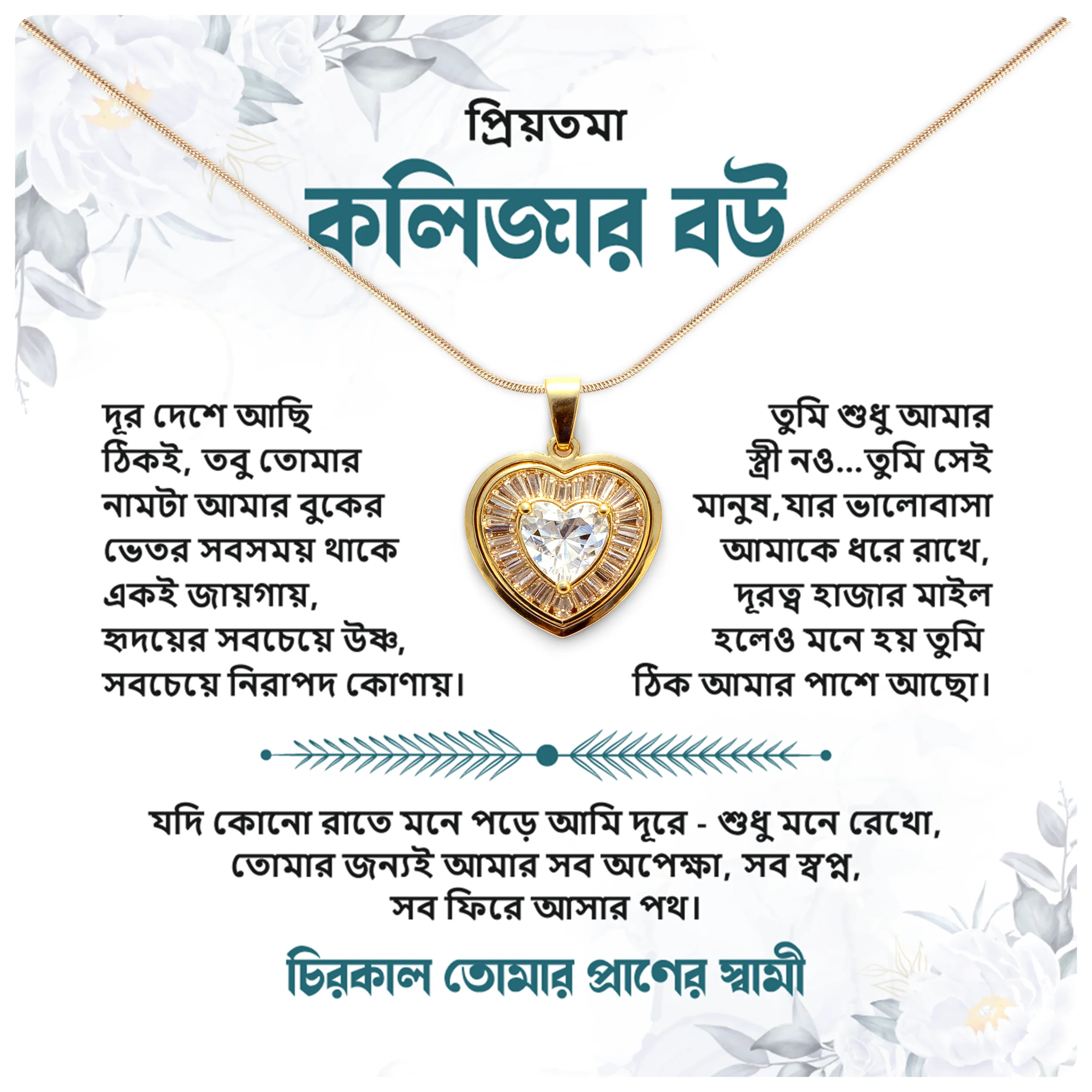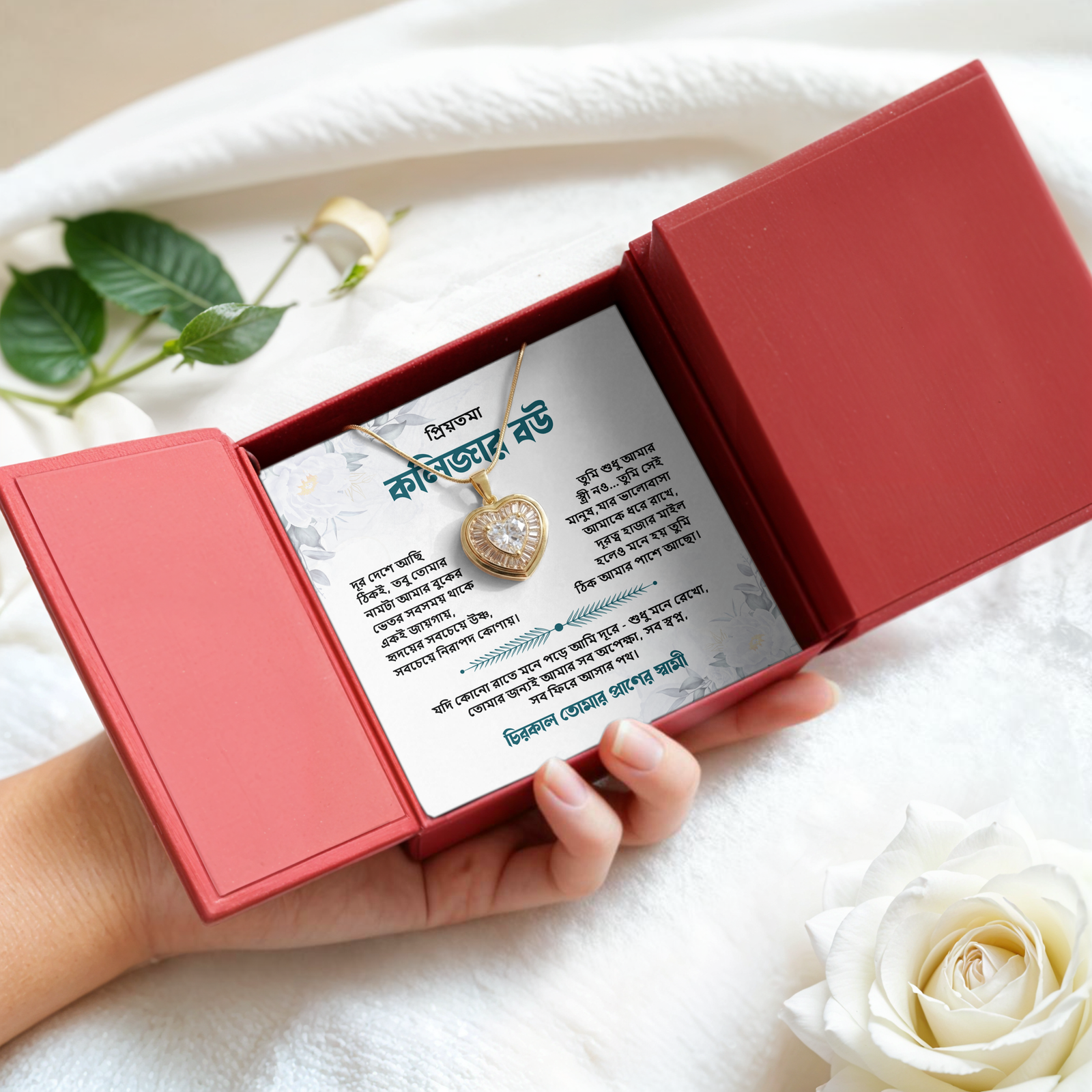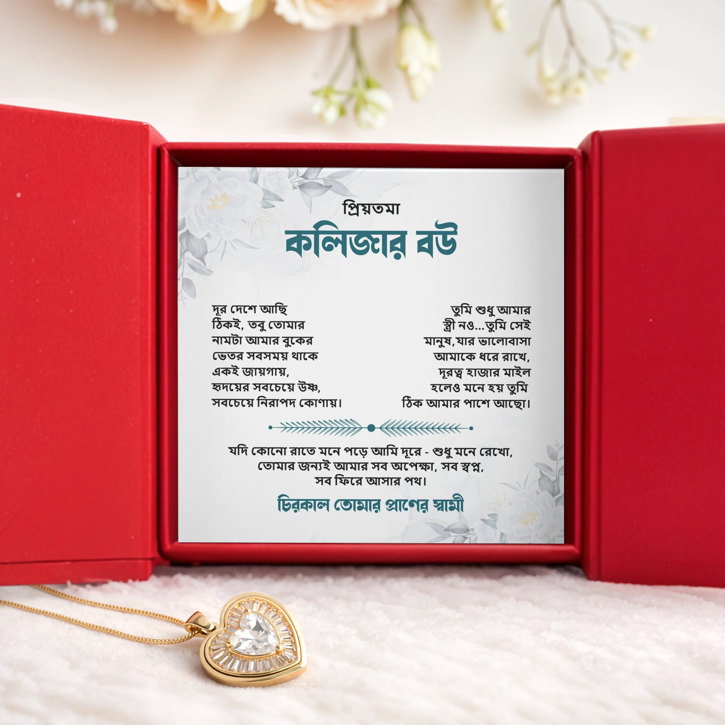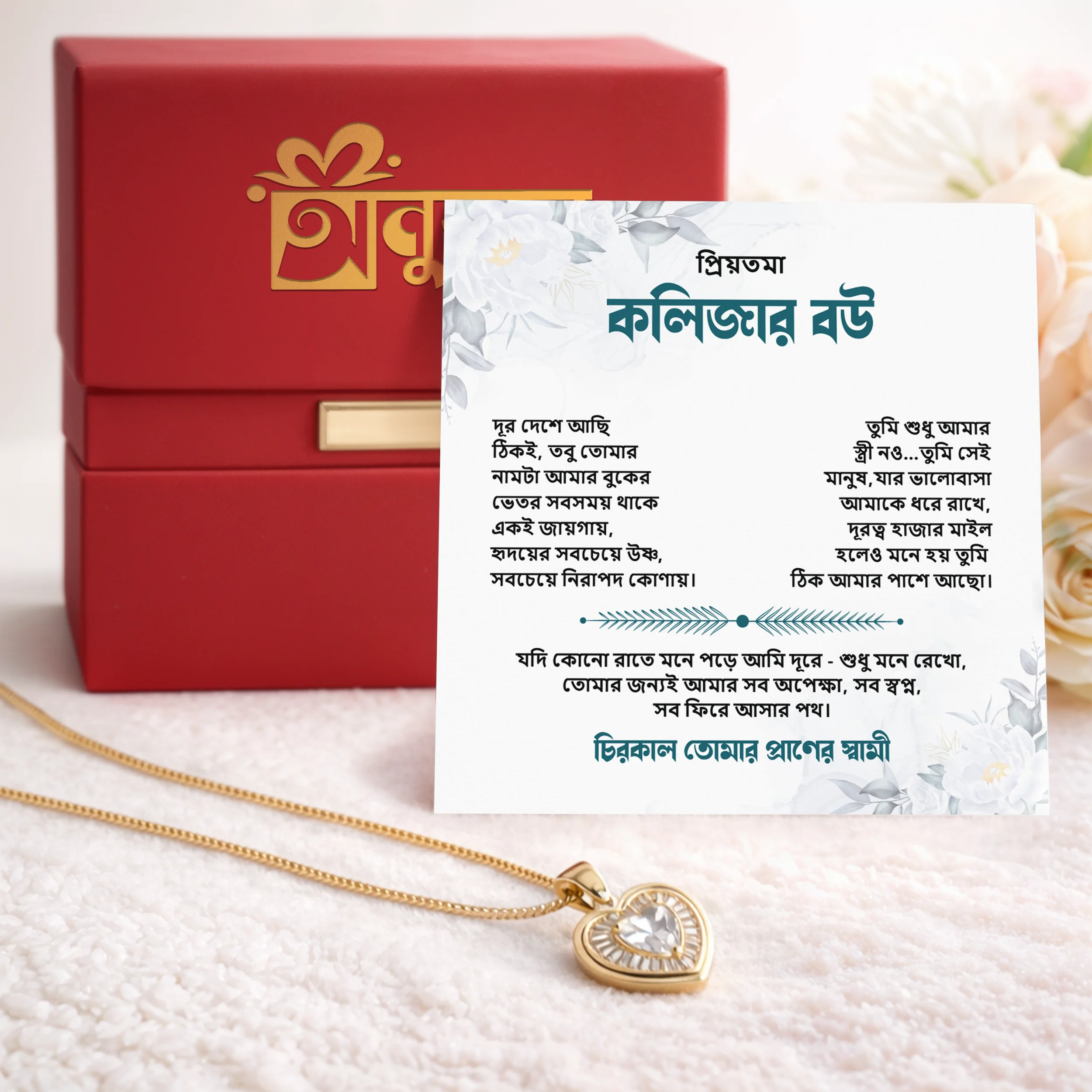 প্রিয়তমা কলিজার বউ হার্ট নেকলেস গিফট বক্স – প্রবাসী স্বামীর ভালোবাসা | onuvobeপ্রিমিয়াম হার্ট শেপ গোল্ড-লুক নেকলেস গিফট বক্স | রেডি মেসেজ কার্ডসহ | রোমান্টিক সারপ্রাইজ প্যাকেজ | Onuvobe